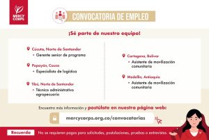 #MercyCorps #ConvocatoriasLaborales #EmpleoColombia #DesarrolloRural #AsistenciaHumanitaria #ParticipaciónCiudadana #TrabajoSocial